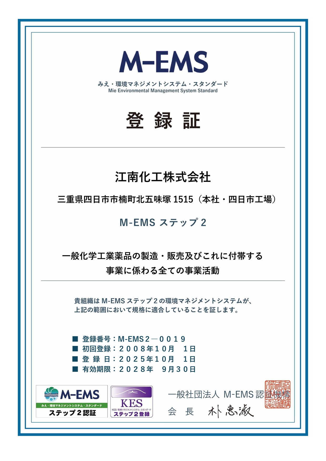 有効期限2025年10月 1日 〜 2028年9月30日 今後もM-EMS活動に全社を上げ活動致します。