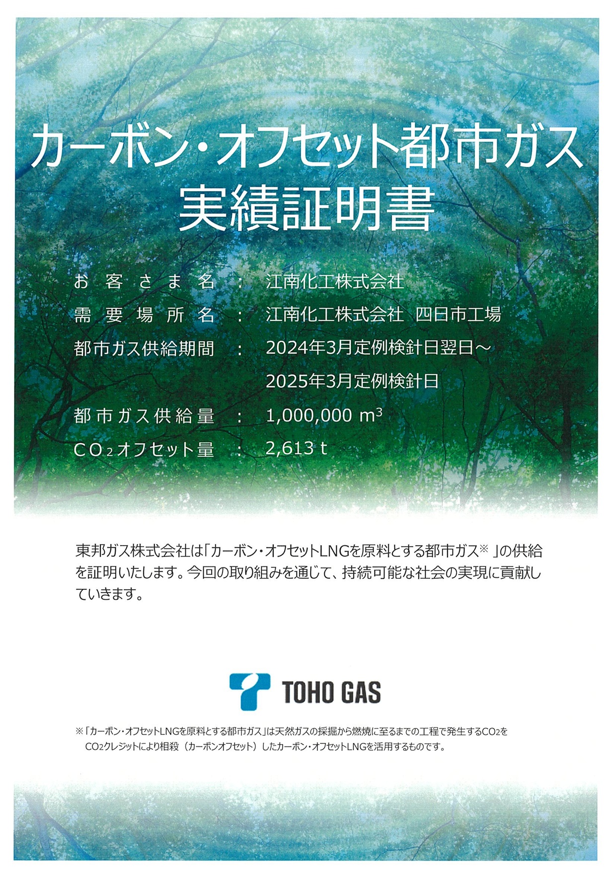 当社はこのたび、東邦ガス株式会社より「カーボンニュートラル都市ガス」の供給実績を証明されました。